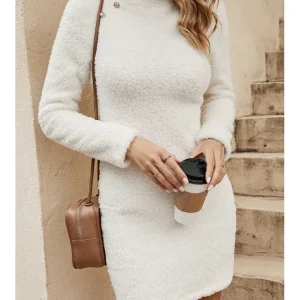 Autumn Women’s Elegant Long Sleeve Mini Dress with Faux Lamb Wool Natural Fuzzy Style