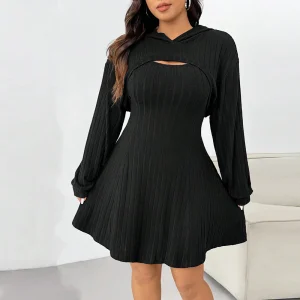 Hot Sale Women’s Plus Size Casual Two-Piece Set Autumn Winter Simple Sweet Style Knee Hooded Shawl Short Skirt Solid Pattern