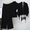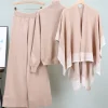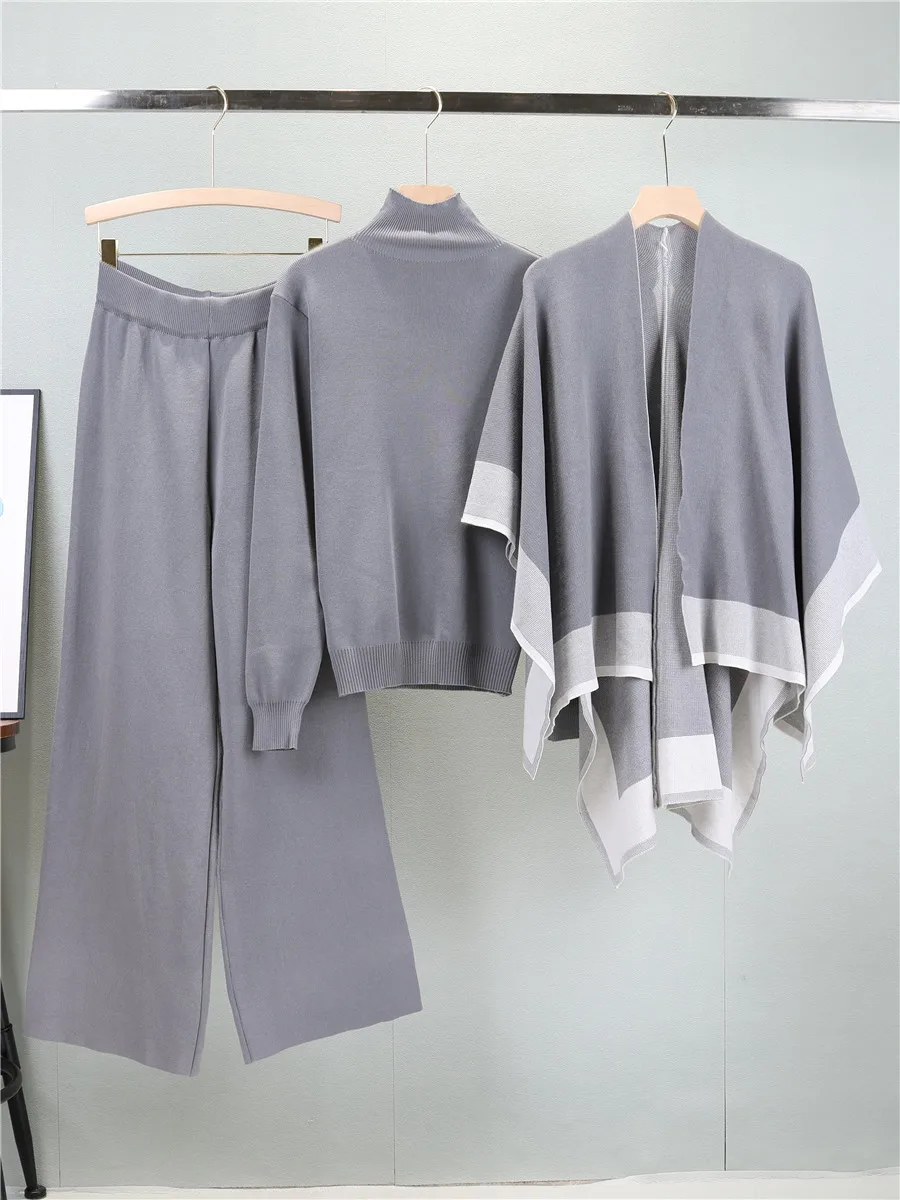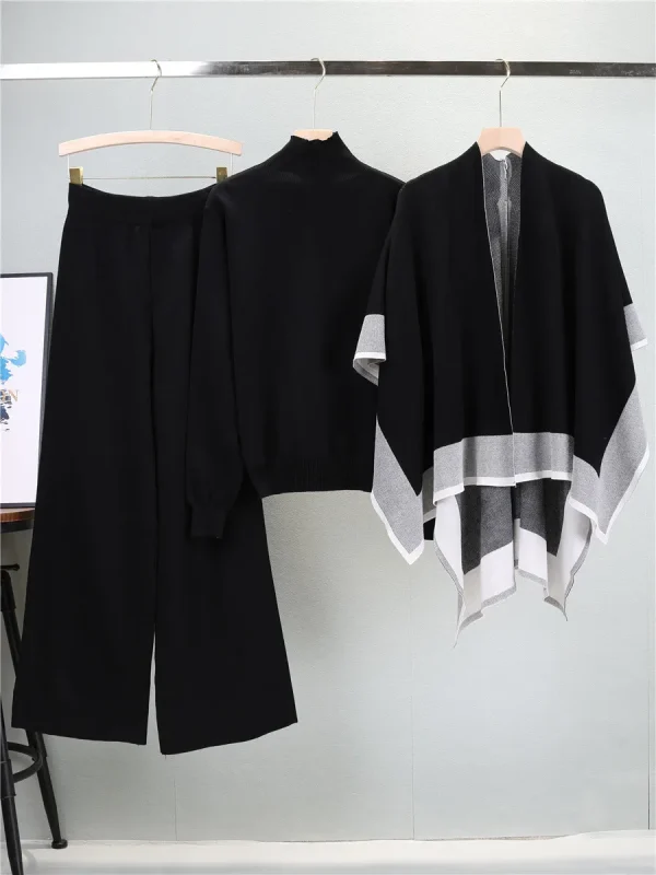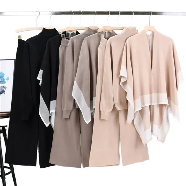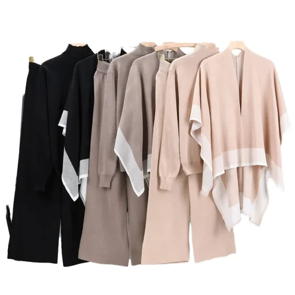 Autumn New Women’s Casual Sweater Set Knitted Shawl and Wide Leg Pants with Stand Collar Woven Technics and Wrinkled Design