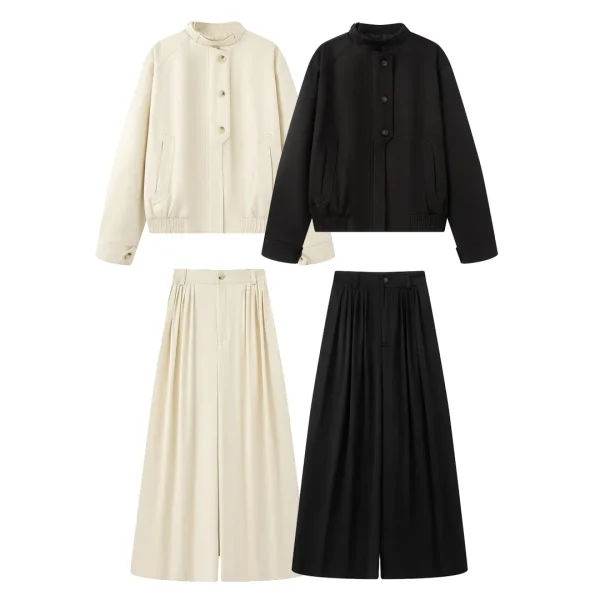 Autumn New Women’s European American Style Solid Color Texture Button Casual Jacket with Long Pant Suit
