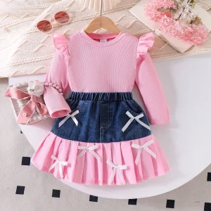 Girls’ Set 2025 Spring and Autumn New Girl Pink Long Sleeved Top Cowboy Short Skirt Two Piece Set