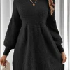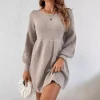 Autumn Winter European American Casual Loose Solid Color Lantern Sleeve High-Waisted A-Line O-Neck Knitted Women’s Sweater Dress