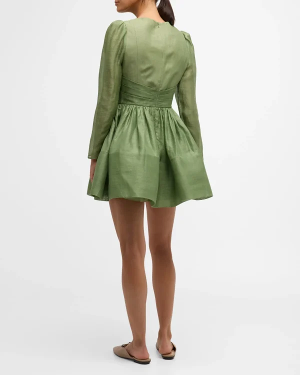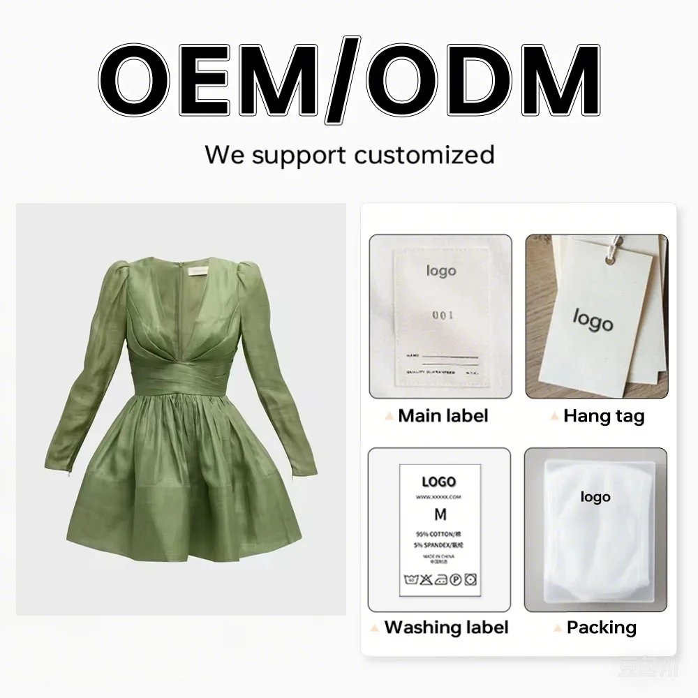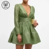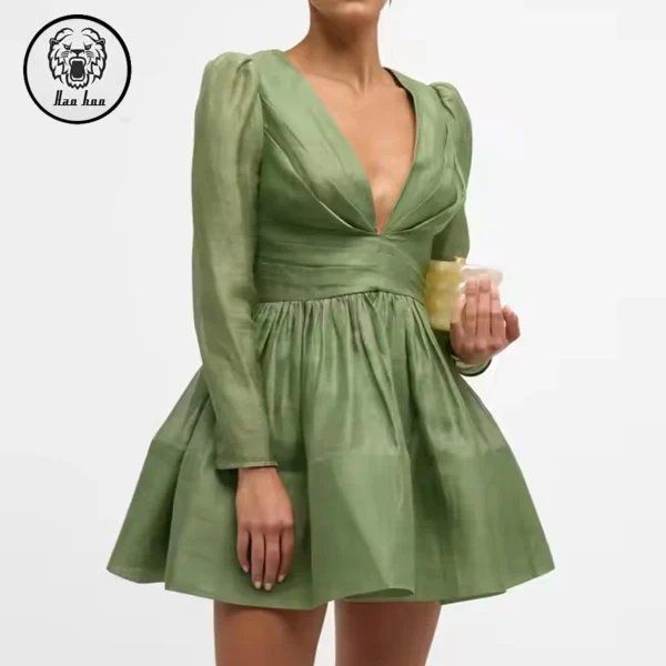 Elegant Lady Fashion Mini Party Dress Fall V-Neck Long Sleeve Pleated Crossover Front Zipper Decoration Technique Plain Dyed