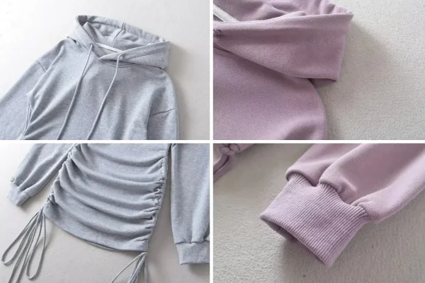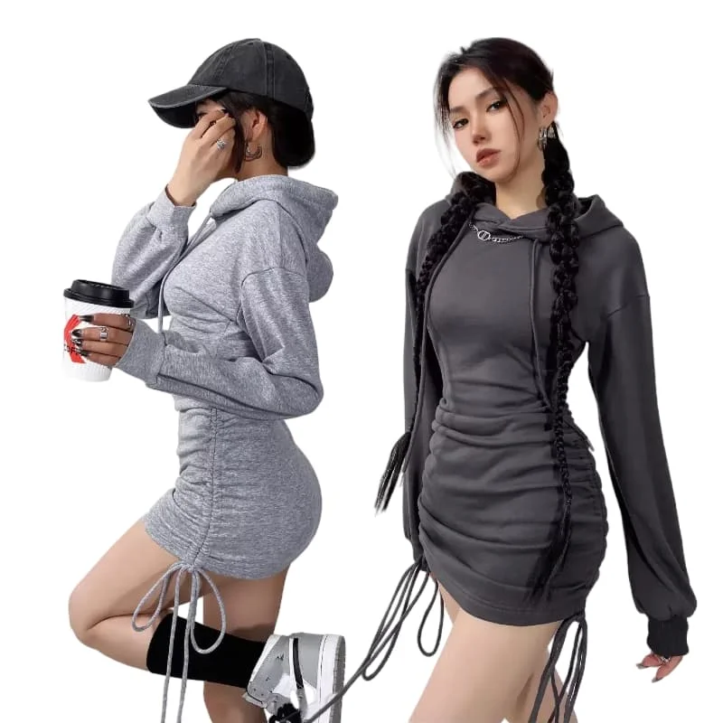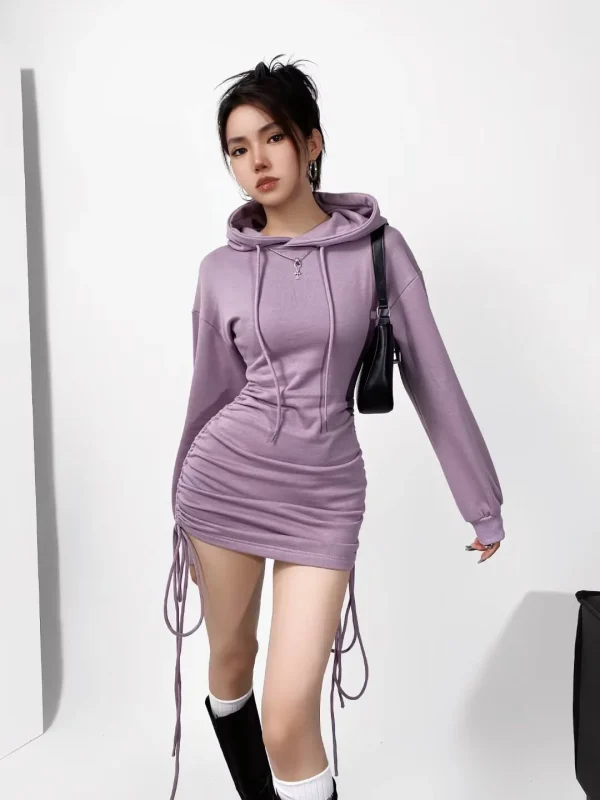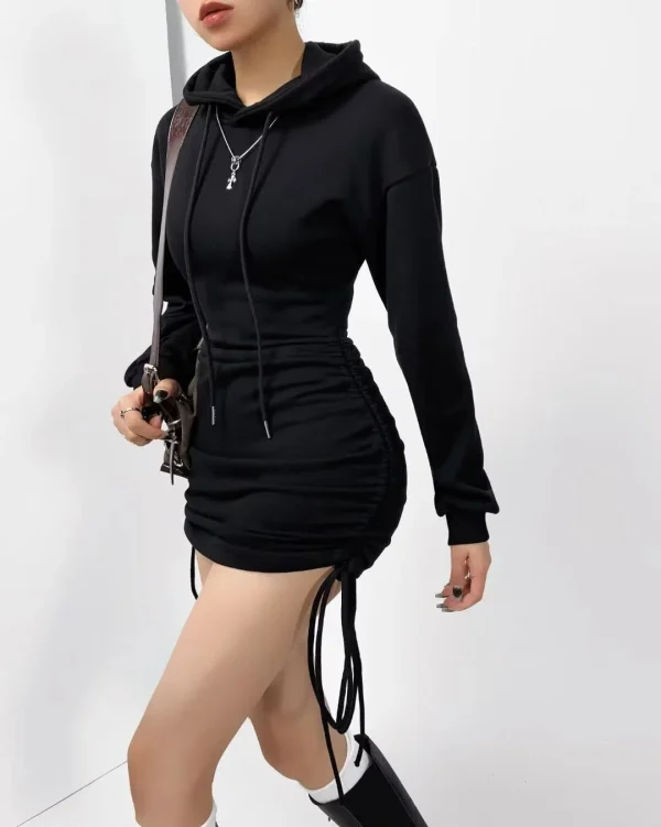 Hooded Y2k Streetwear Autumn Winter Casual Bodycon Ruched Long Sleeve Drawstring Mini Dress for Women Ladies
