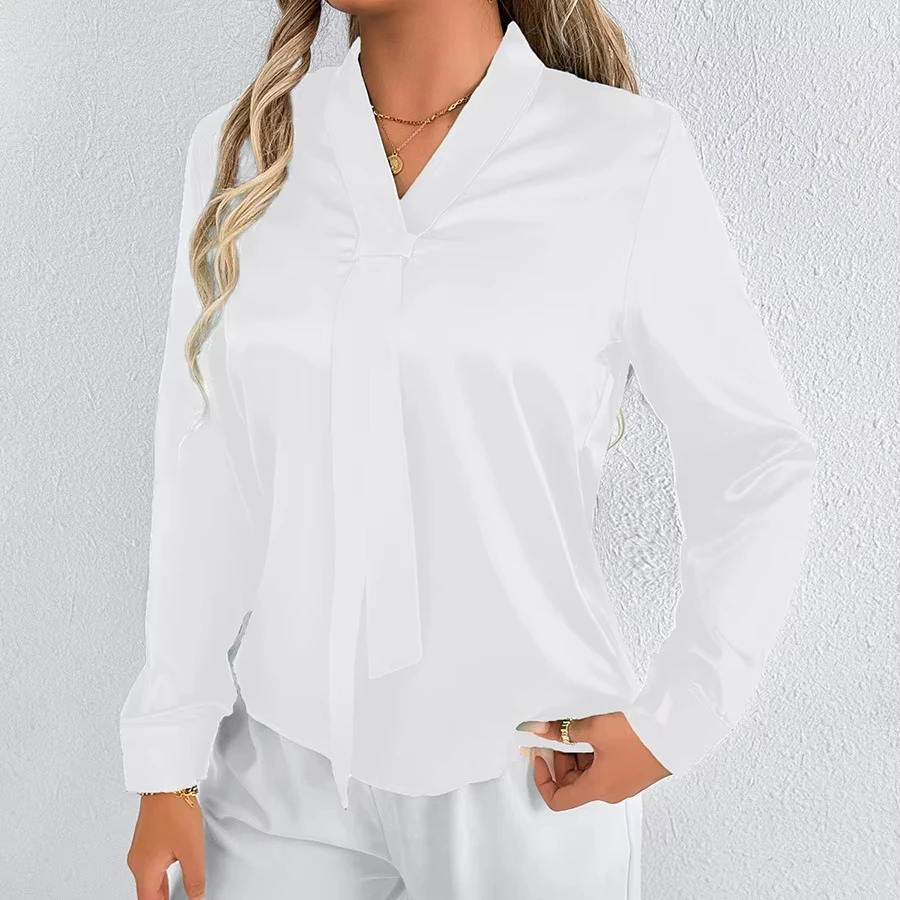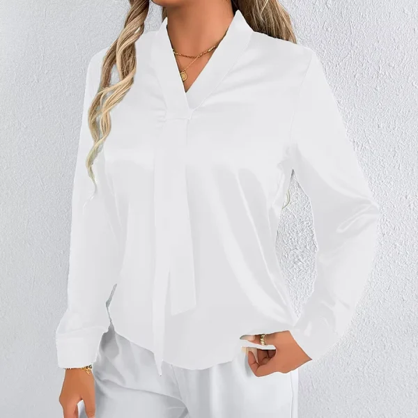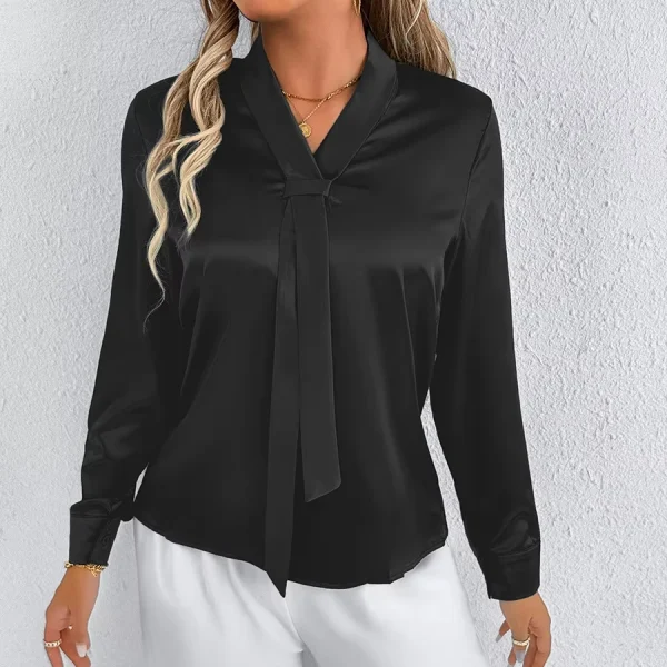 Spring Autumn Women’s Long Sleeve Chiffon Solid Color Bow V-Neck Office Lady Plain Dyed Technique Blouse