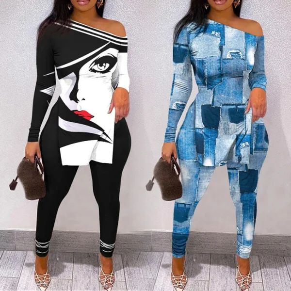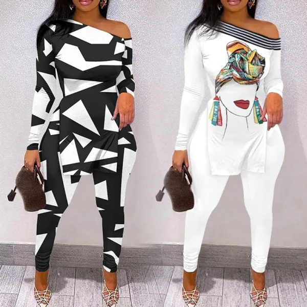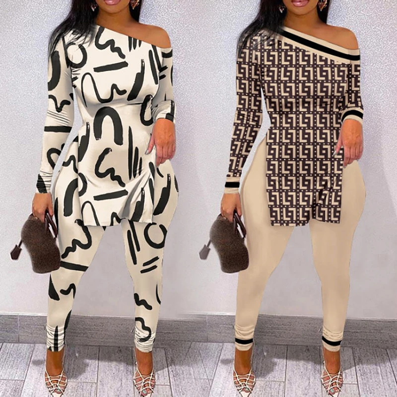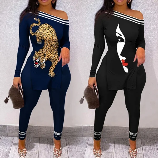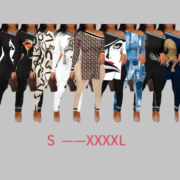 Spring Fall Winter Plus Size Women’s Clothing New Print Split Hem Ladies Long Sleeve t Shirt Top Pants Two Piece Women Sets