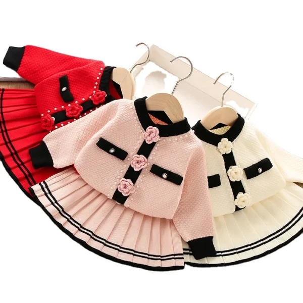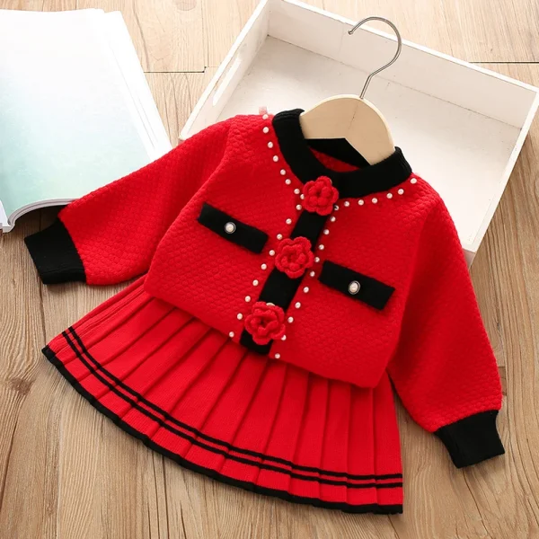 Autumn Red Christmas Floral Knitted Top Skirt Set for Girls Winter Fashion Casual Two-Piece Sweater for Toddler Girls