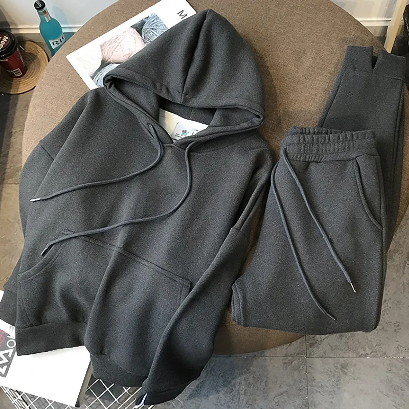 Women’s Autumn Winter Thickened Fleece Hooded Sweatshirt Set Color Stylish Two-Piece Top Loose Fit Casual Sports Fashion