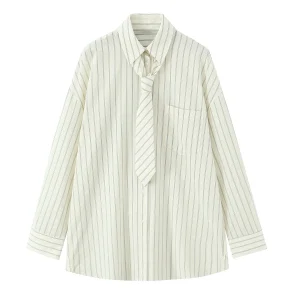 Spring Autumn New Women’s Casual Vintage Style Loose Simple Stripe Tie Button Decoration Woven Shirt